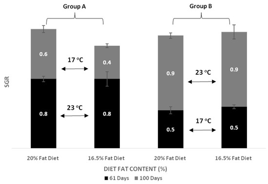 Effect of dietary lipids and water temperature on growth (SGR) of European sea bass (mean ± SD; n = 3).