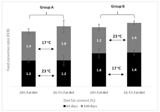 Although the increase in dietary fat for 16 to 20% improved growth, this growth was sufficient enough to compensate the reduction of growth cause by the decrease in rearing temperature from 23 to 17 °C. Nevertheless, we assert that feeding a high-fat diet to fish acclimatized to warmer waters is a good practice for improving growth. This agrees with previous results in this species [36,42] as well as in other species [39,43]. The decrease in FCR at the high temperature in Group A compared to Group B (during the first period) can be explained by the increase in feed intake which the fish needed to reach their growth inherent potential as the temperature was close to the optimum for this species. At the end of the second period (day 100), FCR of Group A (23 to 17 °C) increased while FCR of Group B (17 to 23 °C) decreased, although the differences in FCR between the two groups at day 100 were not statistically significant. The temperature for best feed consumption in many species, such as Nile tilapia (Oreochromis niloticus), hapuku (Polyprionoxygeneios), and others, is slightly higher than the one for best growth, and the temperature for best FCR is lower that the temperatures for best feed consumption and growth [44,45,46] This is in line with our results, as we found higher feed consumption and SGR in Group B (17–23 °C) without an associated improvement in FCR at the end of the trial (day 100).