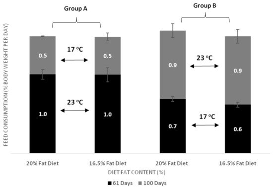 Feed conversion ratio (FCR) and feed consumption are shown in Figure 3 and Figure 4, and Table 3 and Table 4. In the first period (day 61), FCR was lower in Group A compared to Group B in the fish starting at 23 °C. At the end of the experiment (day 100), FCR did not differ between the two groups (Group A and Group B). More specifically, it was noticed that the FCR of Group A increased after transferring the fish to colder water, while the FCR of Group B improved when the fish were transferred to warmer water, resulting in similar FCR values for both groups. Our results showed a significantly higher daily feed consumption for Group A fish that were held at 23 °C during the first period (61 days). No significant impact of dietary lipid level was found on the daily feed consumption in both groups. At the end of the experiment, daily feed consumption was significantly higher in Group B compared to Group A, due to its transfer to warmer water. However, final daily feed consumption did not appear to be affected by the dietary lipid content in both groups (D20 or D16).