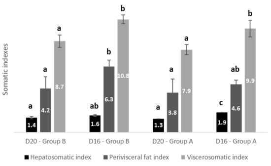 The effects of dietary lipid levels and water temperature on the somatic indexes (hepatosomatic, perivisceral fat, and viscerosomatic) of European sea bass are shown in Figure 5 and Table 5. Significantly lower somatic indexes for fish fed with D20 than those fed D16 were found for both groups A and B. The HSI differed among fish fed the same low-fat diet (D16); a lower HSI value (HSI = 1.6) was observed in those fish fed diet D16 and kept at 17 °C during the first phase of the trial (group B) compared to (HSI = 1.9) for those fish fed diet D16 and kept at 23 °C during the first phase of the trial (group A). For fish fed the same diet with high fat content (D20) and kept under different temperature regimes (either 17 or 23 °C), we did not notice differences in the values of HSI (1.4 vs. 1.3). The above results show an interaction between temperature and dietary lipid content in HSI; while for D20 the difference in temperature does not bring about any change, this does not apply for the for D16, where HSI is influenced by temperature. The perivisceral fat index and VSI were found higher for fish fed diet D16 regardless of the water temperature in both groups. In Group A, no significant difference was observed in the perivisceral fat index (3.8 vs. 4.6) between dietary lipid levels, but VSI was significant higher for fish fed D16 (VSI 7.9 vs. 9.9) in Group A. No statistically significant interaction between temperature and dietary lipid levels in perivisceral fat index or VSI was observed; overall, in any temperature regime (both group A and B), D20 shows lower values for both indices compared to D16.