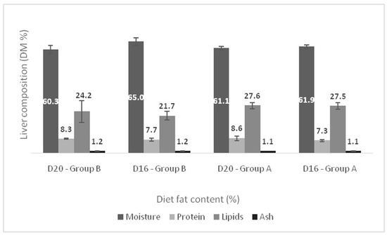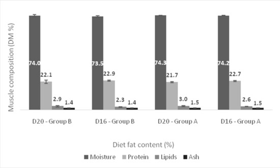 The proximate composition of the muscle and liver of European sea bass held in two temperatures and fed diets containing different lipid levels are shown in Figure 6 and Figure 7. At the end of the trial, no differences were found in the composition of muscle and liver of the fish kept at different temperatures. Similarly, the lipid level of the diet did not significantly affect the proximate composition of both the muscle and the liver.