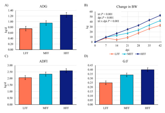 From dpi 0–42, ADG differed among all treatments (p < 0.001), with LFF pigs having the lowest ADG (Figure 1). For MFF pigs, overall ADG was 22 % greater than LFF pigs (p = 0.009). For HFF pigs, overall ADG was 37% greater than LFF pigs (p < 0.001) and 19% greater than MFF pigs (p = 0.037; Figure 1). Overall ADFI was 20% greater in HFF pigs compared with LFF pigs (p = 0.013), MFF pigs being intermediate. Overall G:F was greater in HFF pigs compared with both MFF (13%, p = 0.001) and LFF (20%, p < 0.001) pigs. As a result of these performance differences, end body weight differed among treatments such that HFF pigs were the heaviest at dpi 42, weighing 11.3 kg more than MFF (p = 0.037) and 21.4 kg more than LFF (p < 0.001) pigs. Final (dpi 42) body weight tended to be greater in MFF pigs compared with LFF pigs (p = 0.062).