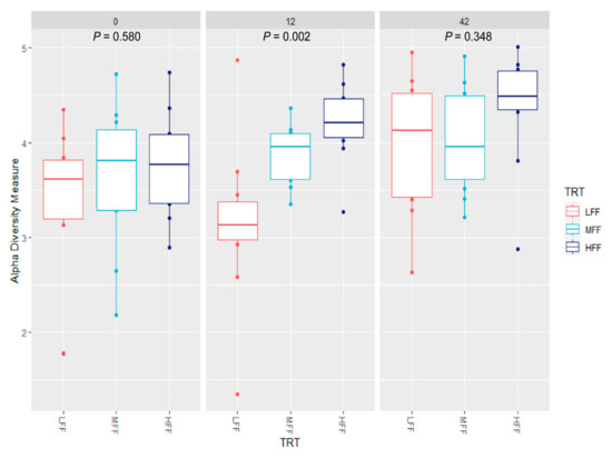 Shannon diversity boxplots of fecal microbial populations in pigs inoculated with Brachyspira hyodysenteriae and fed a lowly fermentable diet (LFF), an intermediate fermentability diet (MFF), and a highly fermentable diet (HFF) at days post inoculation 0, 12, or 42. TRT = treatment.