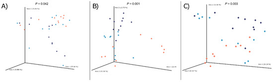 Beta diversity (Bray–Curtis dissimilarity plots) of fecal microbial populations in pigs inoculated with Brachyspira hyodysenteriae and fed a lowly fermentable diet (orange; LFF), an intermediate fermentability diet (turquoise; MFF), and a highly fermentable diet (navy blue; HFF) at days post inoculation (A) 0, (B) 12, or (C) 42.
