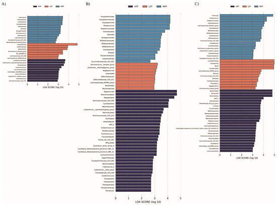 Annotated results from linear discriminant analysis in microbiota samples from pigs fed a lowly fermentable diet (LFF), an intermediate fermentability diet (MFF), and a highly fermentable diet (HFF) and inoculated with Brachyspira hyodysenteriae. All pigs were inoculated with B. hyodysenteriae at days post inoculation (dpi) 0 and fecal microbiota was assessed at (A) dpi 0, (B) dpi 12, and (C) dpi 42.