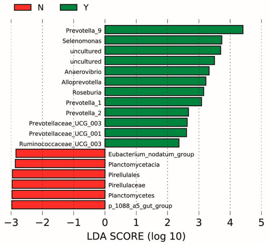 Predicted biological effect sizes of differential taxa using linear discriminant analysis (LDA) in the fecal microbiome of pigs at days post inoculation (dpi) 0 that either did (Y) or did not (N) develop clinical swine dysentery in the 42 d following inoculation with Brachyspira hyodysenteriae. The histogram of LDA scores calculated by LEfSe reveals differentially abundant taxa in the fecal microbiome of the two groups (red = N; green = Y) including overabundance of Prevotella spp. in pigs that developed clinical swine dysentery after inoculation.