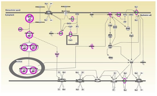 There were 33 pathways significantly inhibited and five pathways activated in the liver by oregano, as shown in Table S4. By far the most significant by the p-value and z-score was aldosterone signaling in epithelial cells (Figure 1), with 19 genes from this pathway among differentially expressed in liver between oregano and control samples: HSP90AA1, HSP90AB1, HSPA2, HSPA5, HSPA8, HSPD1, HSPH1, DNAJA1, DNAJB5, DNAJC12, DNAJC6, ITPR3, KRAS, NR3C2, PIKFYVE, PLCB1, PRKCE, PRKCI, and SCNN1B. Please note that IPA pathway (Figure 1) does not show or color the expression of all individual genes involved in the pathway, but rather it colors inhibited arms of the pathway green and activated as red. Inhibition, in this case (Figure 1), can result from upregulation of genes that inhibit or from downregulation of the genes that enhance the pathway.