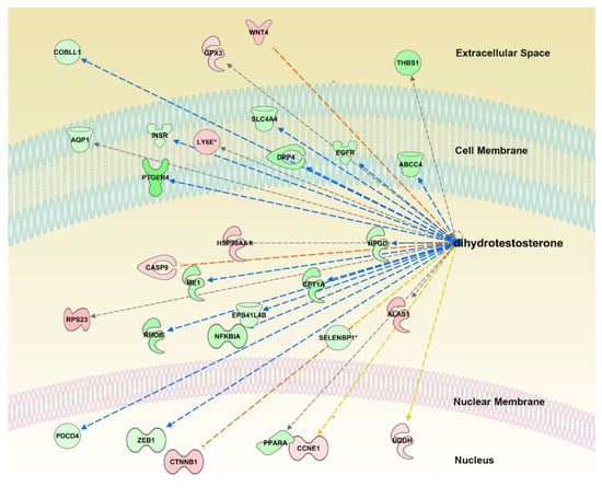 Predicted inhibition of the dihydrotestosterone (DHT) transcriptional regulation. Yellow lines indicate that the direction of gene expression does not agree with predicted inhibition; grey line indicates inconsistent literature on activation/inhibition of the gene by the regulator. Blue line indicates that if the DHT is inhibited the gene should be downregulated (green). Red line indicates that if DHT is inhibited the gene is expected to be upregulated (red).