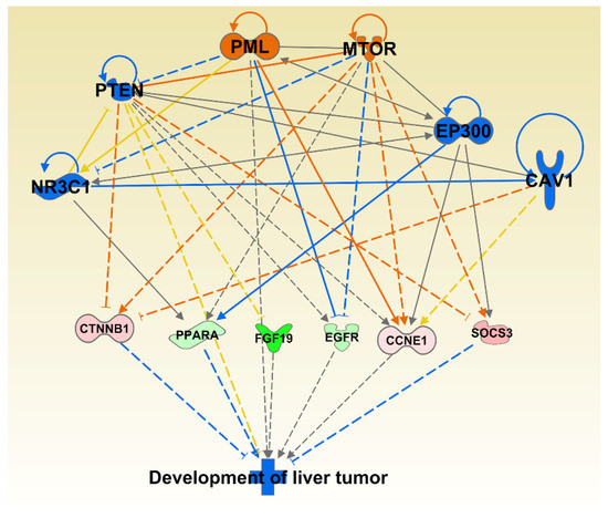We also investigated synergistic regulator effects looking for multiple regulators that are either activated or inhibited to potentially regulate diseases or functions synergistically. The upstream regulators CAV1, EP300, NR3C1, PTEN, MTOR, and PML were expressed in our dataset, activated or inhibited in the direction that could lead to inhibition of Development of Liver Tumor disease category, one of the significantly affected disease categories; p = 5.55 × 10−6 (Figure 3).