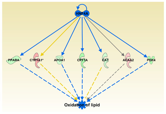 Separately, the upstream analysis identified one transcription regulator, Hepatocyte Nuclear Factor 4 alpha, HNF4A, that was expressed as downregulated in our dataset and identified as an inhibited transcription factor capable of affecting 7 of the 16 genes from the Oxidation of Lipid category. Deeper inspection of all significantly altered subcategories from Lipid Metabolism category indicated that highest contributor to overall category inhibition comes from inhibition of Quantity of Steroid Hormone (p = 6.07 × 10−6, z = −1.92) and Fatty Acid Metabolism (p = 1.9 × 10−4, z = −1.39).