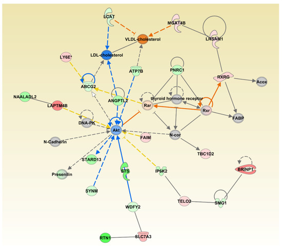 Among the functions significantly affected by oregano supplementation, were eight categories from carbohydrate and 13 from lipid metabolism all highly significantly altered (p = 7.67 × 10−4 to 1.26 × 10−8). Based on z-scores, functions inhibited by oregano were Metabolism of Carbohydrate, Synthesis of Carbohydrate, Uptake of Monosaccharide, Glycolysis of Tumor Cell Lines, Uptake of 2-Deoxyglucose, and Uptake of D-glucose in Carbohydrate Metabolism category. In Lipid Metabolism category inhibited functions were Quantity of Steroid Hormone, Fatty Acid Metabolism, Quantity of Steroid, Quantity of Polyunsaturated Fatty Acids, Conversion of Lipid, Metabolism of Acylglycerol, and Concentration of Lipid (Table S6). It should be noted that there is a strong overlap of genes between the lipid and carbohydrate metabolism categories. Figure 5 shows an overlapping network of interactions between carbohydrate and lipid metabolism.