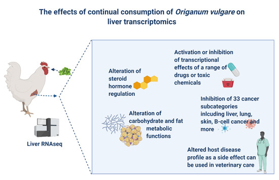 Oregano is one of the most commonly used natural products in poultry production. Despite its “natural” status, our results have shown that oregano is a complex compound with diverse biological effects with implications not only in poultry but also in human health. Continual prolonged consumption of oregano resulted in a range of changes to the liver gene expression in broilers with most prominent effects being inhibition of steroid hormones, fat and carbohydrate metabolism, and a number of cancer disease categories (Figure 6).