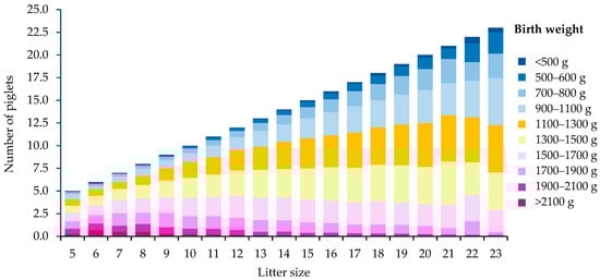 Effect of litter size on birth-weight distribution. The data were collected at Schothorst Feed Research B.V. (Lelystad, The Netherlands) from 2011 to 2019, based on 97,552 piglets born alive from 7888 litters.