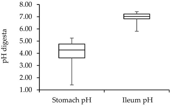 Box plots representing individual variation in digesta pH of the stomach and the ileum 4 h after the piglet’s last meal. Piglets were ± 47 days of age (3 weeks post-weaning). Average stomach pH was 4.04 (SD = 0.991) and average ileal pH was 7.03 (SD = 0.323). The data represent 213 individual piglets that were fed one of 31 experimental diets containing protein-rich feedstuffs (6–8 piglets/experimental treatment; between 2017 and 2020 at Schothorst Feed Research B.V., Lelystad, The Netherlands). The pH of the stomach was measured in the stomach content after thorough mixing. Ileal digesta were taken from the last 2 m of the small intestine and mixed before measuring the pH value.