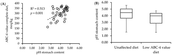 Relationship between the acid-binding capacity (ABC)-4 value of the complete diet and stomach pH. (A) shows the correlation between the ABC-4 value of the complete diet and stomach pH. The data represent the ABC-4 value of 31 experimental diets containing protein-rich feedstuffs (6–8 piglets/experimental treatment) (between 2017 and 2019; Schothorst Feed Research B.V., Lelystad, The Netherlands). The ABC-4 value was measured in meq/kg using the methodology described by Lawlor et al. [151]. Each dot represents the average stomach pH per dietary treatment. (B) shows the effect of acidifying the complete diet on individual stomach pH. The experimental diets contained one of three different protein-rich feedstuffs that are known for their high (i.e., fish meal), intermediate (i.e., Hi-Pro Soybean Meal) and low ABC-4 value (i.e., maize gluten). The values displayed in (B) represent the stomach pH from all protein-rich feedstuffs together. The low ABC-4 diets were acidified by replacing limestone with calcium formate (either completely or partially) and adding citric acid. The unaffected diets did not contain organic acids. The average ABC-4 values of the unaffected diet were 308 meq/kg (SD = 26), with a value of 243 meq/kg (SD = 95) for the low ABC-4 diets. The average stomach pH of the unaffected diet was 4.22 (SD = 0.997), with a value of 3.57 (SD = 1.075) for the low ABC-4 diet.