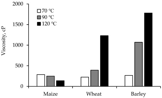 Excessively high processing temperatures can reduce protein digestibility, however, due to Maillard reactions. Furthermore, cereal sources differ in terms of starch-granule size, amylose-to-amylopectin ratios and degree of crystallinity [176]. These differences influence the potential effects of feed processing (e.g., extrusion) on starch gelatinisation and diet viscosity. For example, the heat treatment (e.g., pelleting at different temperatures or expanding followed by pelleting) of diets based on wheat and barley has been shown to increase viscosity, thus yielding the highest diet viscosity at the maximum temperature (Figure 5). No such effect was observed for the maize-based diet.