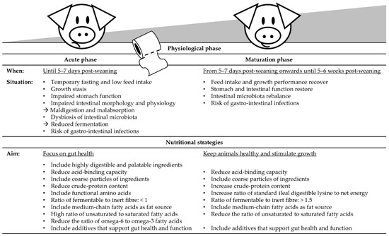 In general, two kinds of piglets can be observed at weaning: those that are robust at weaning and thus better able to cope with the associated changes, and those at greater risk of post-weaning diarrhoea. One major reason for the higher probability of post-weaning diarrhoea is anorexia, which results in maldigestion and malabsorption, followed by associated overeating during the subsequent period [22,23]. Especially during the first two weeks post-weaning, a piglet’s digestive system is immature and incapable of digesting and absorbing all nutrients. Overeating can result in excessive undigested nutrients in the gut, which can subsequently provide a substrate for the proliferation of potential harmful bacteria. In this review, the post-weaning period is classified into two physiological phases: an acute phase (from weaning to 5–7 days post-weaning) and a maturation phase (from 5–7 days post-weaning onwards) [138]. This review focusses on feed formulation and feed-processing strategies aimed at supporting the gut health of weaned piglets. These strategies are subsequently combined into nutritional strategies in relation to the acute and maturation phases of weaned piglets.