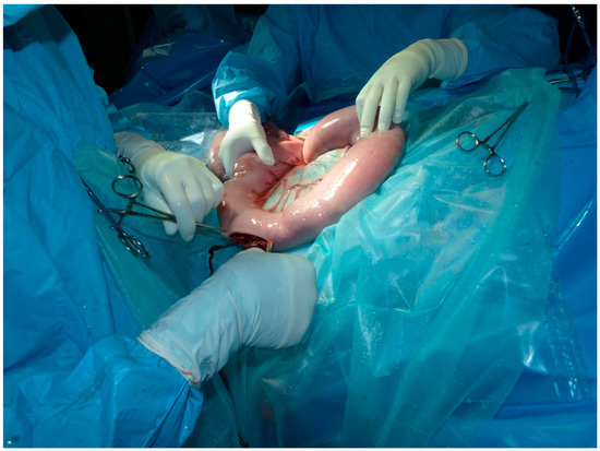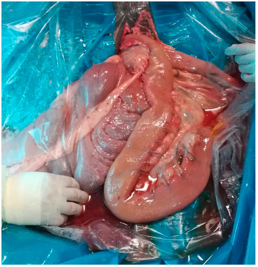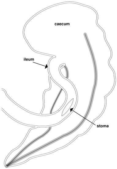 Although colic is a frequently occurring problem in horses, most cases of colic can be resolved medically, and only a small percentage require emergency surgery to avoid fatal outcomes. Approximately 6.6% of small intestine surgical pathologies in horses involve the ileum [1]. The ileum may be involved in a simple obstruction of the ileocecal valve or, as often happens, in strangulating lesions. The reason for this is not clear, and only hypothetical explanations, such as that peristalsis draws it into the entrapment, have been provided [2,3]. In strangulating lesions, if the ileum is necrotic, there is no other choice than resection and anastomosis (either jejunocaecal or jejunoileal); in all other cases (simple obstruction or damaged but viable), it may be necessary to decide to resect the ileum and perform an incomplete ileocecal bypass or manage these conditions conservatively.