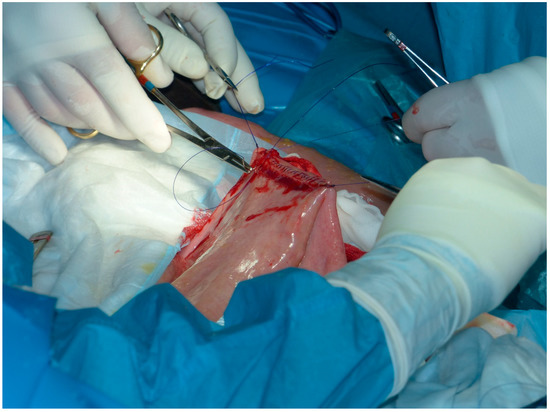 Subsequently, a two layer handsewn side-to-side anastomosis without resection was performed to complete the bypass. The assistant surgeon placed tension on the stay sutures on the same side to align the two intestinal tracts. The first layer of the far side of the anastomosis obtained was with a continuous Lembert suture of USP 2-0 polydioxanone (PDS), joining the antimesenteric side of the ileum and the caecal wall. Once the suture was completed, a 10–12 cm serosubmucosal incision was performed approximately 5 mm on both sides of the suture.