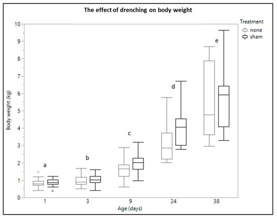 Boxplot of body weight (n = 76) from low birth weight piglets that received no treatment (n = 39) or were sham drenched (n = 37) at different time points (day 1 (n = 76), day 3 (n = 50), day 9 (n = 40), day 24 (n = 35) and day 38 (n = 28)). Significant age differences (linear mixed models, Tukey post-hoc analysis, p ≤ 0.05) are indicated by a different letter.