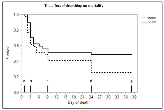 Cumulative mortality of low birth weight piglets that were sham drenched (n = 37) or received no treatment (n = 39) over time. Significant differences (Cox’s proportional hazard model, Kaplan–Meier survival plot, p ≤ 0.05) between time points are indicated by a different letter.