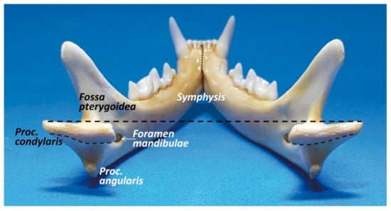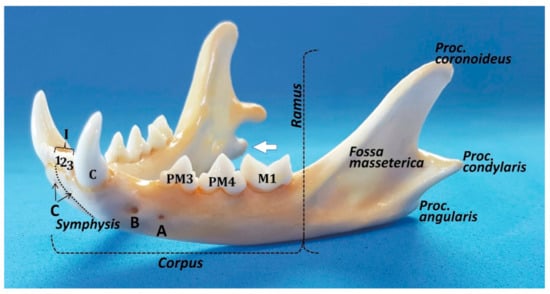 Starting with the anatomical description of the feline mandible, and according to the Veterinary Anatomical Nomenclature [7,8], the cat jaw has two halves (mandibula) joined rostrally by an articulatio intermandibularis, known as the mandibular symphysis (in carnivores, partially conformed by a synchondrosis and a sutura intermandibulares). Each mandibular half has a horizontal part (body, or corpus mandibulae) and a vertical part placed caudally (ramus mandibulae; Figure 1). The mandibular ramus has a dorsal part, oriented slightly caudally, with a coronoid process (processus coronoideus) on the top (which attaches the temporal muscle), and two faces with both fossae for muscle fixation: a masseteric fossa (very deep, laterally—fossa masseterica) and a pterigoid fossa (medially—fossa pterygoidea). More or less at the same level as the dorsal margin of the body, completely caudally, there is the condylar process (processus condylaris), a cylinder oriented horizontally that articulates with the mandibular fossa of the temporal bone and participates in the temporomandibular joint (TMJ) (articulatio temporomandibularis). On the caudal part and ventrally, there is an angular process (processus angularis), oriented caudally.