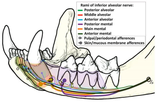 - Robinson, P.P. The course, relations and distribution of the inferior alveolar nerve and its branches in the cat. Anat. Rec. 1979, 195, 265–271. [Google Scholar] [CrossRef] [PubMed]
