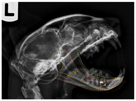 Postmortem radiography of a cat head, laterolateral projection (left lateral recumbency). The yellow outline corresponds to the left mandible and the orange one to the right jaw. The respective coloured empty arrows point the mandibular foramina, and the small arrows indicate the main mental foramina. The orange circle shows signs of tooth root resorption and the white arrow points evidences of a dental root fracture. Note that a plastic needle cap was used to keep the mouth open. As plastic is radiolucent, it does not interfere with the radiologic image.