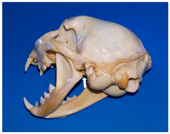 It is the unique joint with a whole articular disc (discus articularis) that has developed owing to a slight articular surface incongruity [20]. However, in the cat, the temporomandibular joint is highly congruent [17] and the articular disc is very thin and poorly developed. According to Arredondo et al. [21], it is attached around its entire periphery to the capsule, dividing the synovial cavity into two separate spaces—dorsal and ventral. The periphery of the disc is irrigated by small branches from the articular temporomandibular artery [21]. In the cat, the condyloid process formed by the caput mandibulae consists of a slender, transverse roller 13–15 mm wide with a diameter of 2–3 mm (Figure 2). The axis of the articulated roller is oriented transversely at the line of the occlusal plane [17]. Caudally oriented, it presents a highly curved convexity medial to the mandibular body that narrows laterally and the outer end is often pointed [22].