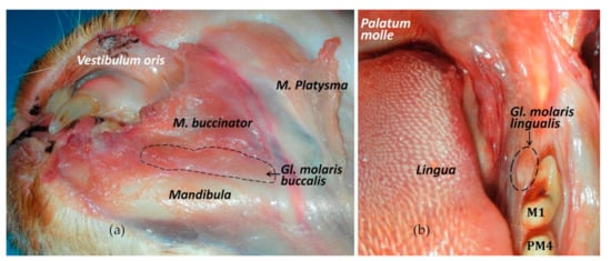 The cat molar salivary glands. (a) Ventrolateral view of the buccal molar gland. (b) Frontal view of the lingual molar gland, caudomedially to the first molar tooth.