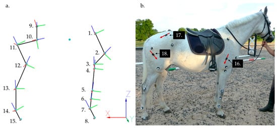 (a) The rigid segment model created for the subject in (b), showing marker locations (white spheres) and virtual landmarks (turquoise spheres), including the virtual CM maker. Black lines indicate segments. Red, green and blue lines indicate the mediolateral, anterior–posterior and dorsoventral axes, respectively, of each segment coordinate systems (SCS). Anatomical locations for marker placement are as follows: 1. proximal end of the spine of the scapula, 2. greater tubercle of the humerus (representing center of rotation of the shoulder joint), 3. lateral epicondyle of the humerus (center of rotation of the elbow joint), 4. lateral tuberosity of the radius, 5. lateral styloid process of the radius, 6. proximal end of metacarpal IV, 7. the metacarpal epicondyle (center of rotation of the metacarpophalangeal joint (MCPJ)), 8. lateral hoof wall (approximately over center of rotation of the distal interphalangeal joint (DIPJ)), 9. between the tubera sacrale, 10. most ventral part of the tuber coxae, 11. greater trochanter (center of rotation of the hip joint), 12. lateral epicondyle of the femur (center of rotation of the stifle joint), 13. talus (center of rotation of the tarsal joint), 14. the metatarsal epicondyle (center of rotation of the metatarsophalangeal joint (MTPJ)), and 15. the lateral hoof wall. (b) Anatomical locations for sEMG sensor placement are as follows: 16. triceps brachii, 17. middle gluteal, and 18. biceps femoris. Red arrows indicate the orientation of sEMG sensors, which ensured that electrode bars were orientated perpendicular to underlying muscle fiber direction.