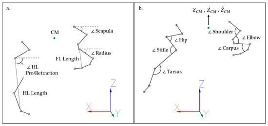 Illustration of joint angles, segment angles, segment lengths and the center of mass (CM) target used to calculate discrete kinematic variables, and the x, y, z axes of the lab coordinate system (LCS). For illustrative purposes, variables are depicted during (a) jump take-off and (b) jump suspension but were calculated across both A1 and jump strides. (a). scapula segment angle, radius segment angle, CM target, forelimb (FL) segment length, hindlimb (HL) segment length, pro/retraction angle of hindlimb (HL) segment (b) CM vertical displacement (), CM vertical velocity (), CM vertical acceleration () and an illustration of the flexor side of shoulder, elbow, carpus, hip, stifle and tarsal angles.