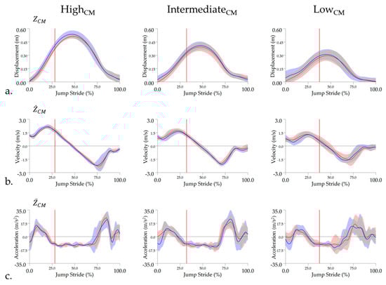 Mean and standard deviation time–course data for vertical (a) displacement (ZCM), (b) velocity (), and (c) acceleration () of the center of mass marker. Data are presented in separate columns for HighCM, IntermediateCM, and LowCM groups and are normalized to jump stride duration. Red vertical lines represent the average hindlimb lift-off event within each group. Mean data are presented for leading hindlimb (LdH) (red line) and trailing hindlimb (TrH) (blue line), with shaded areas representing the standard deviation for each limb.