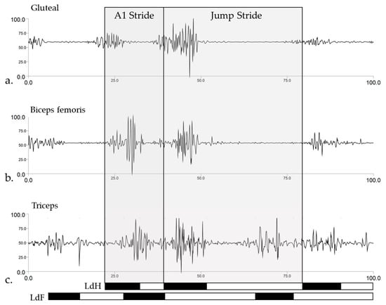 Phasic activity patterns of (a) gluteal, (b) biceps femoris, and (c) triceps muscles from a representative IntermediateCM horse and jump trial. Approach (A1) stride and jump stride are labelled and illustrated as grey shaded boxes. sEMG signals are direct current (DC)-offset removed and high-pass filtered (Butterworth 4th order, 40 Hz cut-off frequency). Bottom bars represent stance (black shaded areas) and swing (white shaded areas) phases for the right hindlimb and forelimb that acted as leading hindlimb (LdH) and leading forelimb (LdF), respectively, during this jump trial.