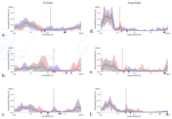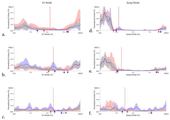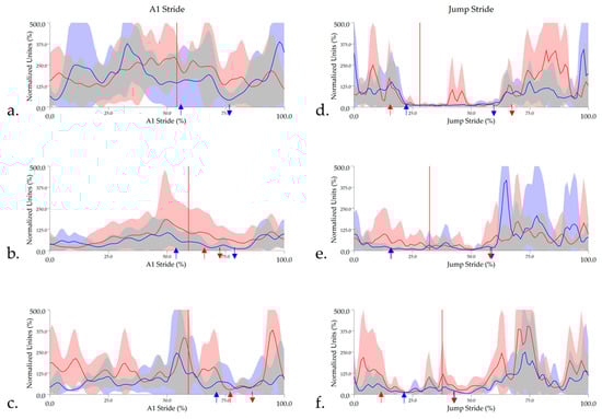 Mean and standard deviation time and amplitude-normalized, linear enveloped sEMG signals from gluteal for (a) HighCM, (b) IntCM, and (c) LowCM horses during approach (A1) stride and (d) HighCM, (e) IntCM, and (f) LowCM during jump stride. sEMG signals are DC-offset, high-pass filtered (40 Hz cut-off) and low-pass filtered (25 Hz). Mean data are presented for leading hindlimb (LdH) (red line) and trailing hindlimb (TrH) (blue line), with shaded areas representing the standard deviation for each limb. Arrows represent the mean gluteal activity onset (downward arrows) and offset (upward arrows) events for LdH (red arrows) and TrH (blue arrows). Red vertical lines represent the average hindlimb lift-off event within each group.