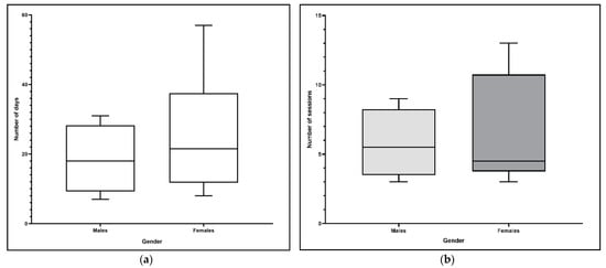 With regard to gender, there were no differences in response to the rehabilitation protocol in terms of the days and the number of therapy sessions (p = 0.81 and p = 0.99, respectively; Figure 1a,b).