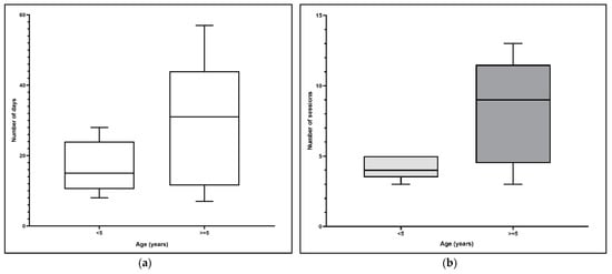 To examine the effect of age, we used the mean age (5 years) to divide dogs into younger adults (<5 years) and older adults (>5 years). There were no differences between these groups with regard to the days and the number of therapy sessions (p = 0.28 and p = 0.10, respectively; Figure 2a,b).