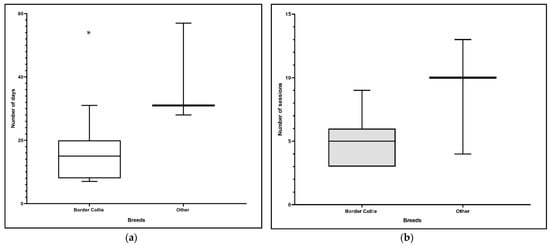 Finally, we compared border collies with the other affected breeds and found a difference (p = 0.04) for the number of days from start of physiotherapy to recovery (Figure 3a). Specifically, border collies required fewer days for recovery. However, there was no difference between border collies and the other breeds for the number of therapy sessions (p = 0.24; Figure 3b).