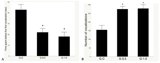 The synbiotic effect on isolation test of broilers exposed to chronic heat stress. (A) The latency to give the first vocalization; and (B) the number of vocalizations during the test. Treatments: a regular diet supplemented with 0 (G-C), 0.5 (G-0.5), and 1 (G-1.0) g kg−1 synbiotic, respectively. * significant difference (p < 0.05) from controls. Data presented as means ± SE (n = 8, 16 birds/treatment).