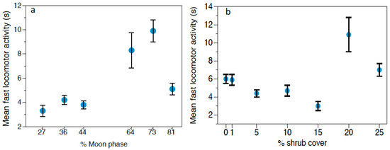 (a) Mean fast locomotor activity time (s) ± SE displayed by R. rattus depending on the shrub cover thickness. (b) Mean vigilance time (s) ± SE of R. rattus depending on moonlight.