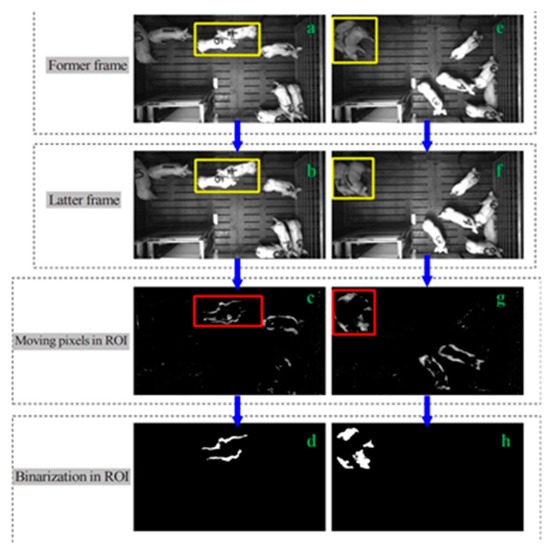 Kinect depth Sensors clarifying behaviours often mistaken as non-aggressive by human observation: (a–d) aggressive pigs moving slowly, (e–h) aggressive pigs demonstrating limited activities. (ROI = region of interest). Reprinted with the permission from ref. [11]. Copyright 2019 Elsevier.