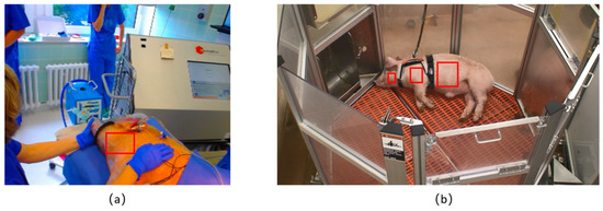 Figure 1. (a) Experiment set-up of the anesthetized pig; (b) experiment set-up of the resting pig. The red rectangles represent regions of interest chosen to investigate for heart rate monitoring.