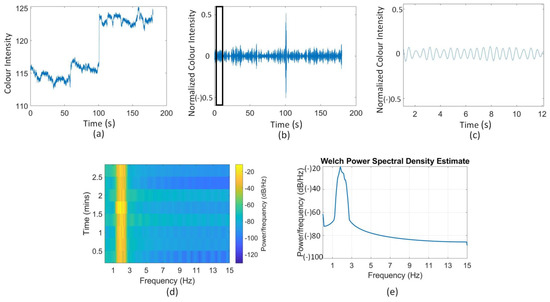 Figure 4. (a) The original G channel signal of the anaesthetized pig plotted in time-domain; (b) the filtered G channel signal; (c) a zoom-in view of the filtered signal; (d) time-frequency spectrogram; (e) the Welch power spectrum density (PSD) estimate.