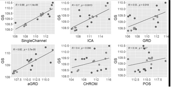 In previous studies [12,13,35,36] of extracting HR from video signal, three-channel signals were combined in four different proportions: green-red difference (GRD), adaptive green-red difference (aGRD), chrominance-based method (CHROM), plane-orthogonal-to-skin (POS), and they were defined as follows. Assume r, g, b are the color signal of the three channels, then: