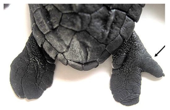 Lepidochelys olivacea showing syndactyly (arrow, dorsal view). Photograph taken from supplementary file in [13] with the permission of the authors and publisher (John Wiley & Sons).