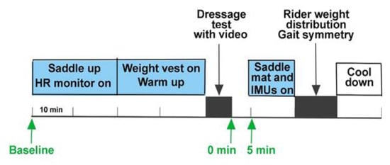 A standard dressage test carrying a rider with the addition of 0%, +15% or +25% of the weight of the rider in random order. Rider weight was shown not to affect the horses’ performance [] and will not be considered here.