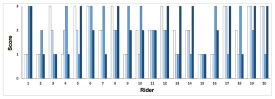 On the vertical axis, grade awarded for evaluation of rider performance (pelvic roll: white; pelvic circles: light blue; balance on ball: medium blue; quality and harmony of riding: dark blue) for 20 riders shown on the horizontal axis.