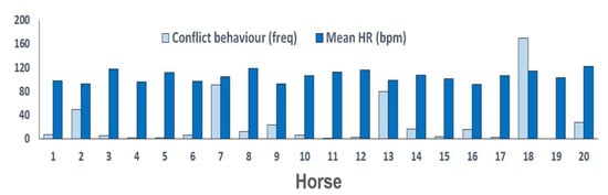 On the vertical axis, frequency of conflict behaviors (light blue columns) and mean HR (dark blue columns) during the riding test for 20 rider-horse combinations shown on the horizontal axis.