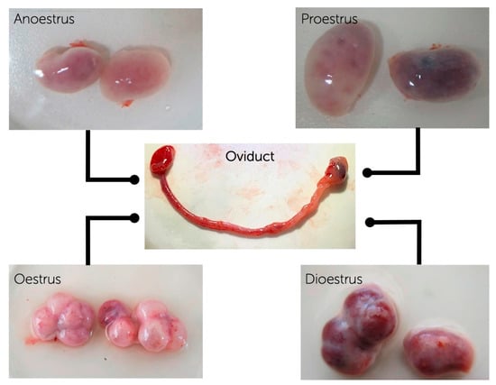 The mixed-breed female dogs with the ages between 1–4 years, at different phases of the oestrous cycle (anoestrus = 9, proestrus = 7, oestrus = 8, and dioestrus = 11) were used for the first part of the experiments. Ovaries, oviducts, and part of the uterine horns were collected and transferred to the laboratory in physiological saline solution (0.9% w/v NaCl) containing penicillin G (100 IU/mL) and streptomycin sulphate (50 mg/mL) at 37 °C, within 2 h after the routine ovariohysterectomy. The oviducts were classified into the different phases of the oestrous cycle according to the morphology of growing follicles and/or corpus luteum (CL) on the surfaces of the corresponding ovaries as previously described [] (Figure 1). To confirm the oestrous phase, plasma progesterone levels in blood samples obtained during the surgery were also assessed according to the previous studies [,]. In brief, 5 mL of blood samples without anticoagulant were centrifuged at 2500× g for 10 min. The supernatants were used in analyses. The progesterone concentration of each blood samples was evaluated in duplicates by an enzyme-linked fluorescence assay (ELFA) on the Mini-Vidas automated analyser (Biomerieux, Marcy l’Etoile, France) [], using progesterone (P4) canine kits (VIDAS® Progesterone #30409, Biomerieux). The mean coefficients of variation were 3.2 (%) and 5.3 (%) for the intra and inter assays, respectively. The minimal limit of detection was 0.25 ng/mL []. Bitches were considered in anoestrus when progesterone values were less than 0.5 ng/mL; proestrus 0.6–1.9 ng/mL; oestrus 2–19 mg/mL; diestrous more than 20 ng/mL [].