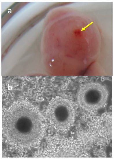 Representative photos of (a) canine ovary with ovulated follicle. The arrow shows the ovulation fossa in the top of the follicle; (b) ovulated canine oocytes collected from the oviducts (×300).